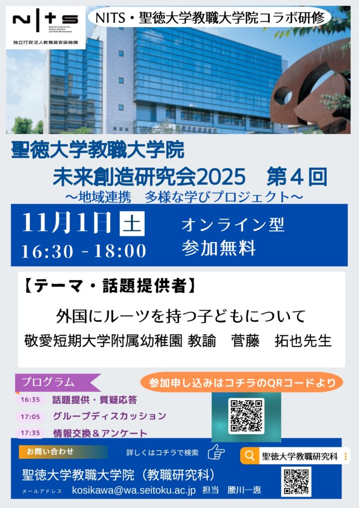 NITS・聖徳大学教職大学院コラボ研修「未来創造研究会2025」第4回研究会のお知らせ
