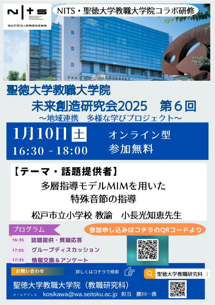 NITS・聖徳大学教職大学院コラボ研修「未来創造研究会2025」第6回研究会のお知らせ