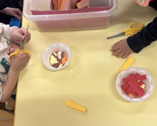 3歳児のクラスでは、ダンボールで作ったカバの餌を作って遊ぶ、幼児の姿がみられました。教師が用意した細長い紙を、ハサミを用いて自由に切って、餌を作っているのです。その中で、幼児Aが、「これ、チョコレートだよ!」と言いながら、たくさんの茶色の紙を切っていたっていたところ、幼児Bが、「ぼくだって、チョコレート作りたかったんだよ。もう茶色の紙、なくなっちゃうじゃん!」と、悲しそうな表情で言う場面がありました。一瞬、けんかになるかと思われましたが、幼児Aは、「チョコレートはいろいろな味があるんだよ。これならイチゴ味のチョコレートができるよ。」と赤い紙を差し出しました。幼児Bは、「そうだね。」と、赤い紙を切り始めました。その後、黄色の紙を使ったバナナ味のチョコレートや、緑の紙を使ったメロン味のチョコレートもできました。