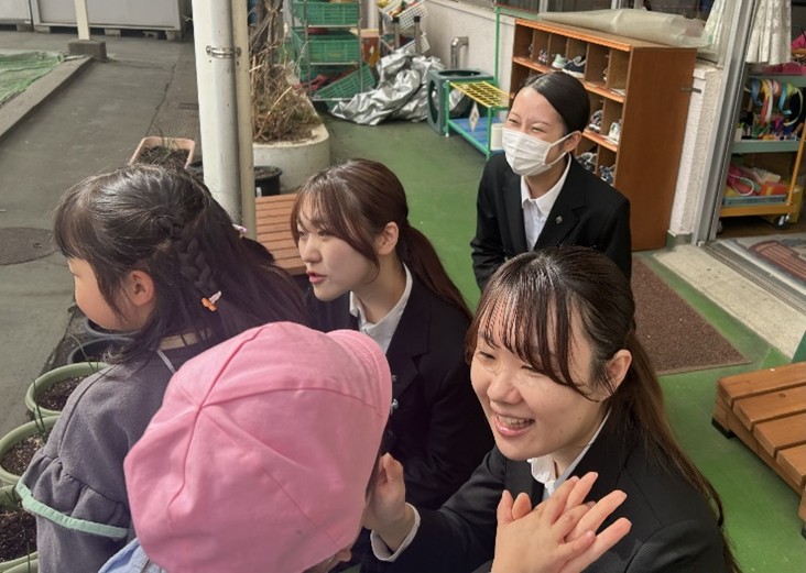 「学部、短期大学の学生のみなさんに学びにきていただきました。園児は優しいお姉さんに絵本を読んでもらったり、話を真剣に聞いてもらったりしたことで、とても嬉しい気持ちになったと思います。まだまだ甘えたい年齢の子供たちが、優しく関わってくれる他者と出会うことで、人への信頼感が育まれていくのだと考えます。学生の皆さんにとっても、園にとっても学び合う素敵な経験となりました。ありがとうございました。機会があったら、また来ていただければと思います。」